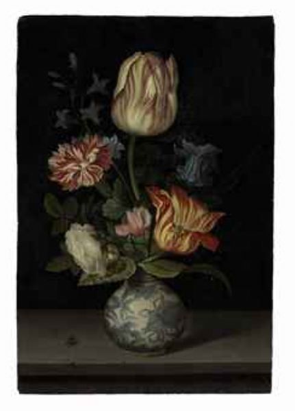 | Tulips, a rose, carnation, columbine, cyclamen, and creeping bellflower in a wan-li vase on a ledge with a fly | |
