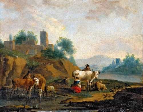 FLUSSLANDSCHAFT MIT BAUERN UND VIEH