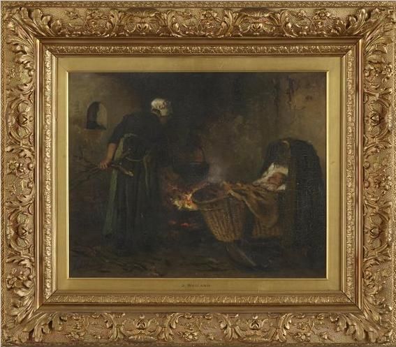 MOTHER TENDING THE FIRE WHILE BABY SLEEPS