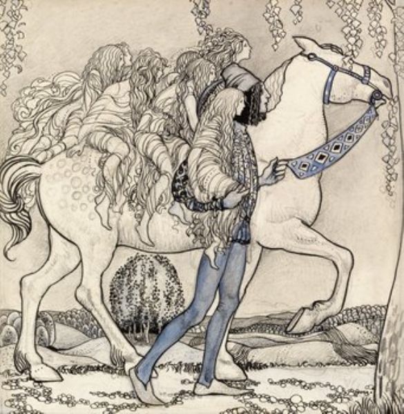 | Hästen ledde han vid betslet och på det viset färdades de genom skogen | |
