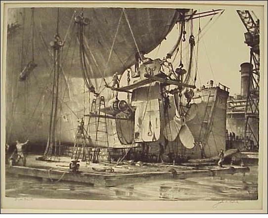 | dockside scene with workers overhauling large ship, pencil signed lower right | |