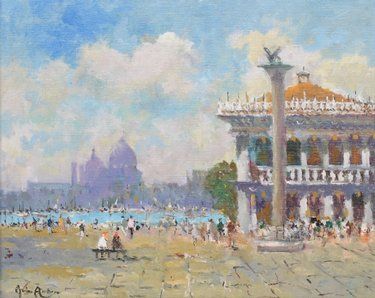 figures by a Venetian harbour with Basilica di San Marco in the distance