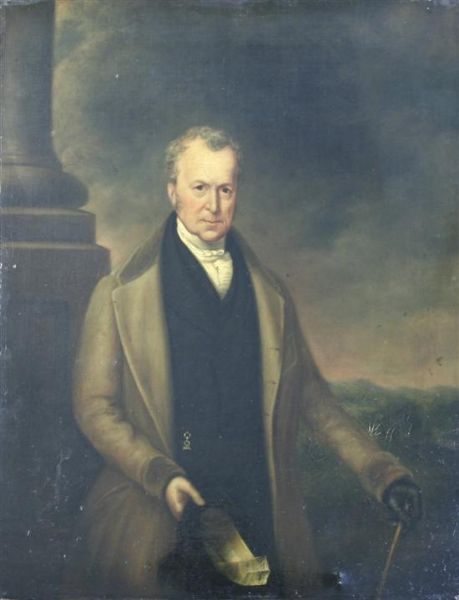 | Portrait of a gentleman standing holding the prospectus for "an elegant freehold mansion" | |