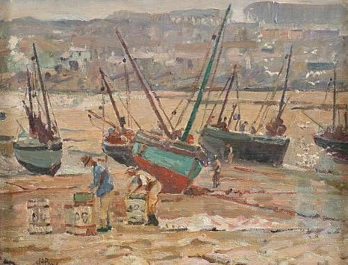Fishing boats and figures at low tide in the harbour mouth, St Ives
