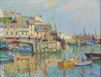 Harbour scene with rowboats.