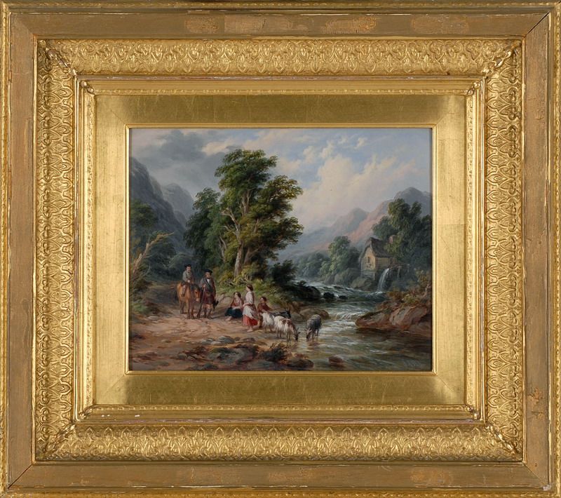 | A conversation on the river bank between three women, a man and a child on a small horse. A mill and mountains fill the backgrou | |
