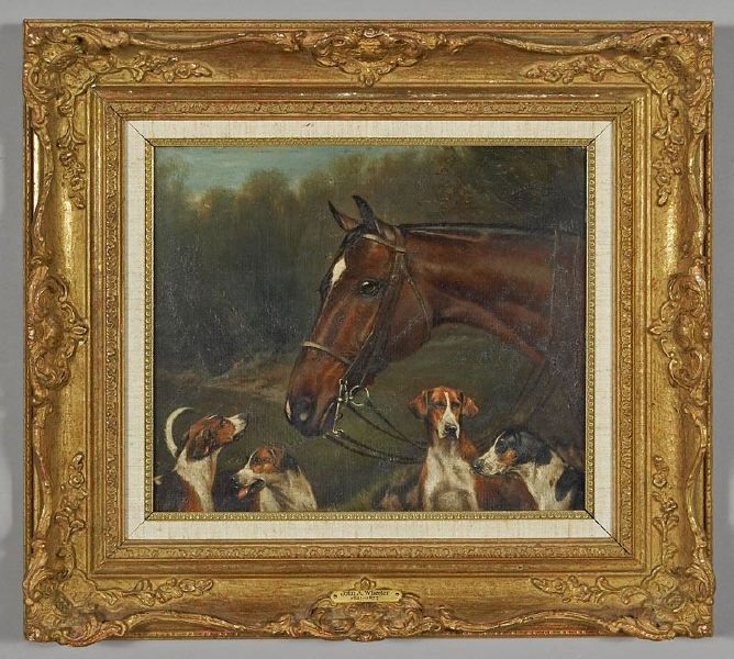 | depicting the profile of a horse and hunting dogs | |