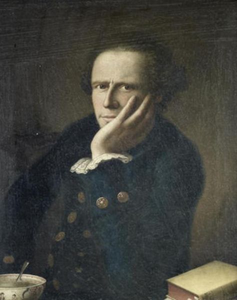 | Portrait of a gentleman, half-length, in a green velvet coat, seated at a table with a bowl of soup, a music score, a pair of di | |