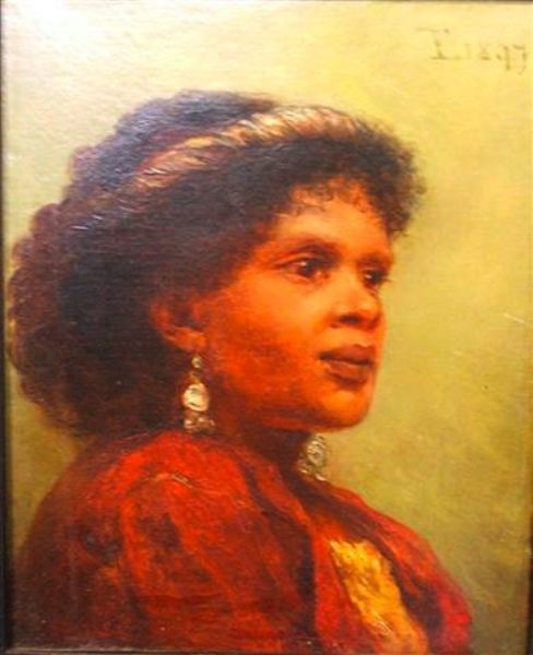 | Portrait of a Negress Child, her hair tied by a ribbon and wearing drop earrings and red dress | |
