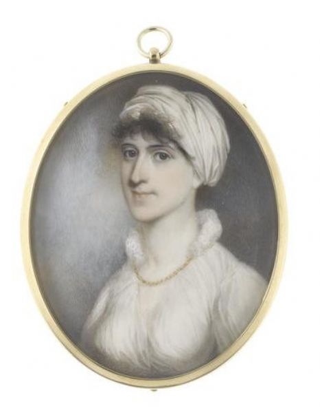 A Lady, wearing white dress and a gold necklace, her dark hair upswept beneath a white turban.