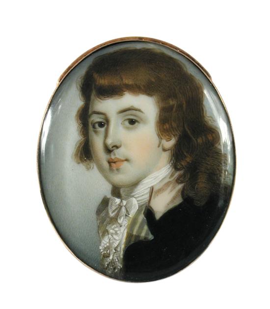 | Portrait of a young gentleman, wearing a dark green coat with yellow and grey striped lapel and pink collar with a lace cravat a | |