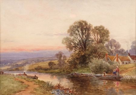 River Scene with Figures and Cottages
