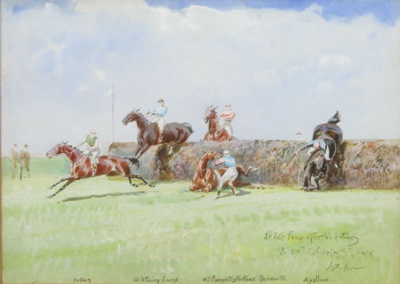 | The Fence After Valentines Champions, Fith Chase, study of a horse race with fallen horses in foreground | |