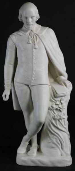 A Minton Parian Figure of Shakespeare; his hand resting upon a tree-stump beside manuscripts