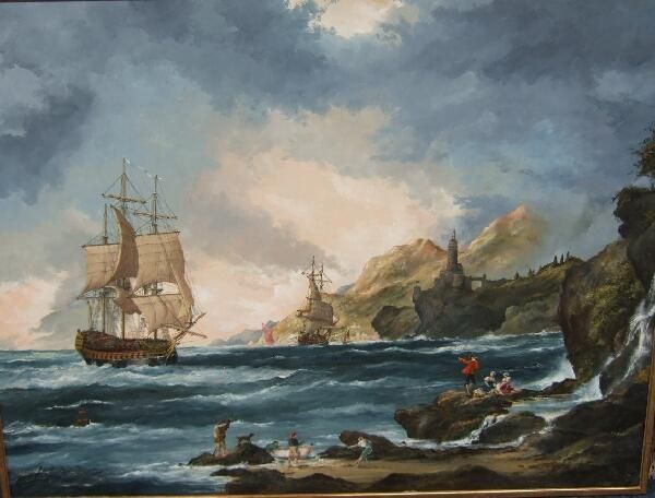 | Sailing ships off a rocky Mediterranean coast, with figures in foreground | |