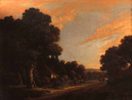 Figures, Horse and Cattle in a Country Lane by a Cottage