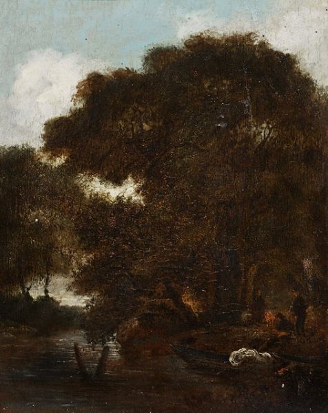 River landscape with figures attending to a camp fire whilst sheltering under a tree