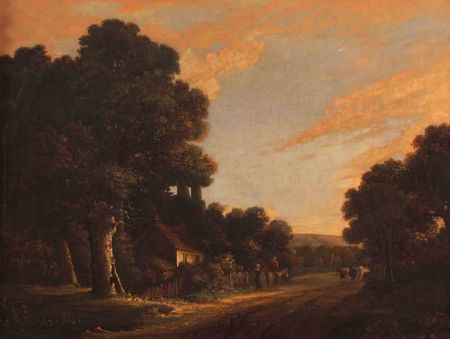 Figures, Horse and Cattle in a Country Lane by a Cottage