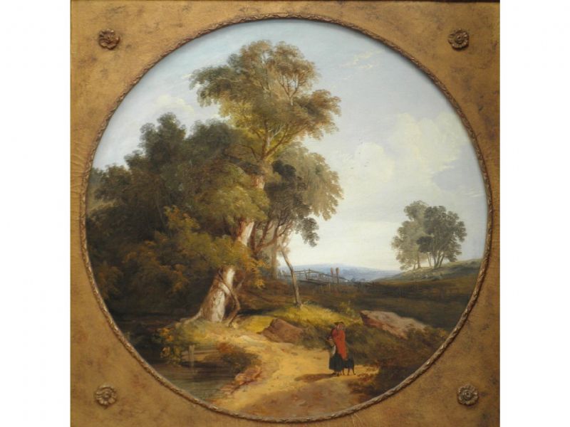 | A woman with basket and dog in the foreground on a wooded country path, with landscape | |
