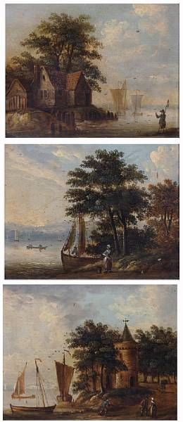| Figures and boats by a waterside chapel; Waterside house; Woman on a shore | |
