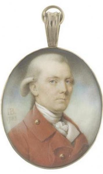 | A Gentleman, wearing red coat with gold buttons, white waistcoat, stock and lace cravat, his powdered wig worn en queue. | |