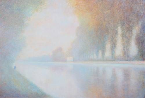 Angler by a poplar lined river