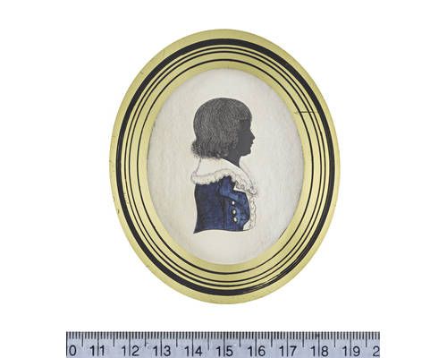 A silhouette of a Boy, profile to the right, wearing blue jacket, white waistcoat and frilled collar.