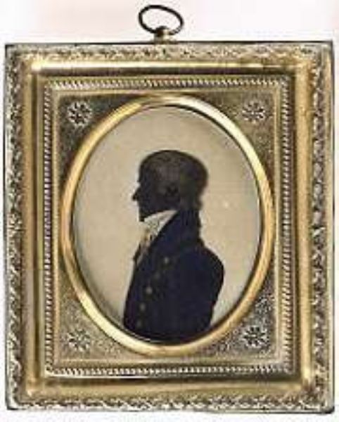 | A silhouette of a Gentleman, profile to the left, wearing blue coat, white waistcoat and tied stock | |