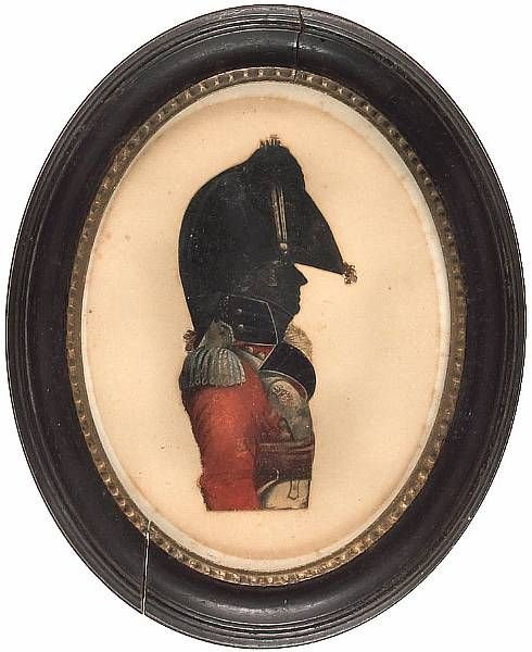 | A silhouette of a junior Officer of Volunteer Infantry, profile to the right, wearing scarlet coatee with dark facings | |