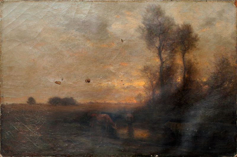 Pastoral Sunset Landscape with Cows and Stream in the Barbizon Style