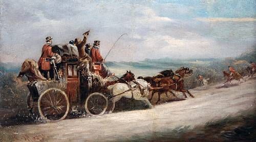 A coach and four with a hunt passing before them