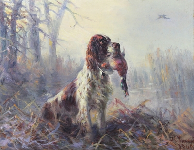 | 'Frosty Morning', a study of a shooting dog with a duck, in the reeds | |