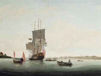 | A British man-o'war saluting her departure from her anchorage on the Thames at Greenwich | |