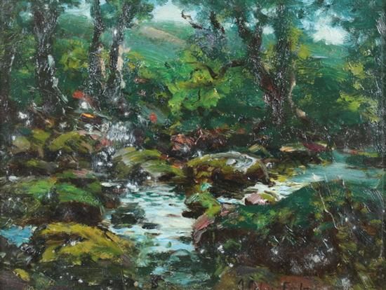 | IMPRESSIONIST VIEW OF STREAM AMIDST BRIGHTLY COLORED FLORA, LUSH VEGETATION AND TREES IN A FOREST | |