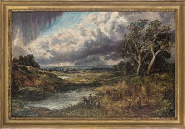| Anglers and farm workers beside a pool in an extensive landscape | |