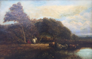 | Figures in a wooded landscape with cattle watering at a river, a distant church spire beyond | |