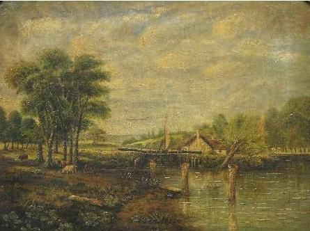 | river landscape with a cottage by lock gates, horse and rider on one bank and cattle grazing beneath trees on the other | |