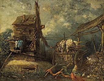 Landschaft mitWindmühle, Karren und Hühnermädchen