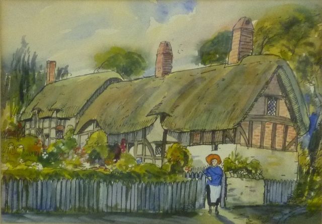 Ann Hathaway's Cottage with a figure by the picket fence
