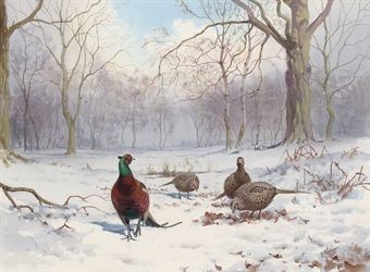 | A cock pheasant and three hen pheasants in a snow-covered woodland glade | |