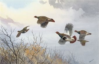 | Partridge in flight over trees, Autumn | |