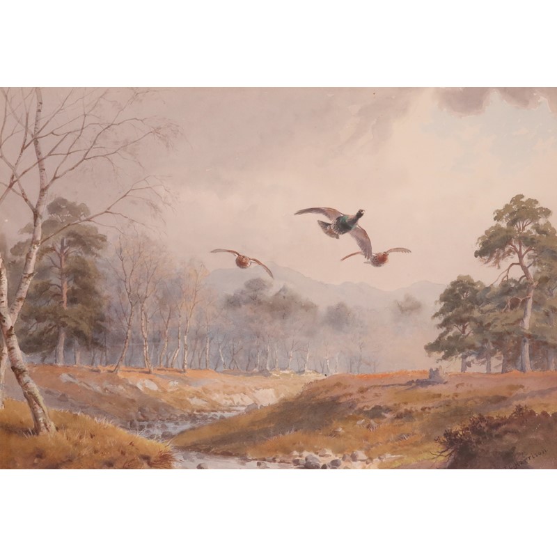 Three Capercaille over a wooded stream
