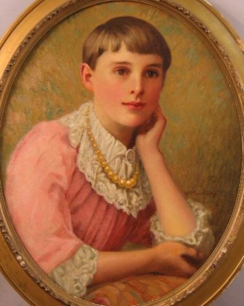 portrait of W G Goodchild, half length, depicted wearing pink dress and pearl necklace