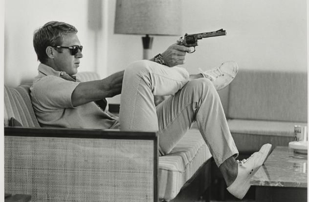STEVE MCQUEEN AIMS A REVOLVER IN HIS LIVING ROOM