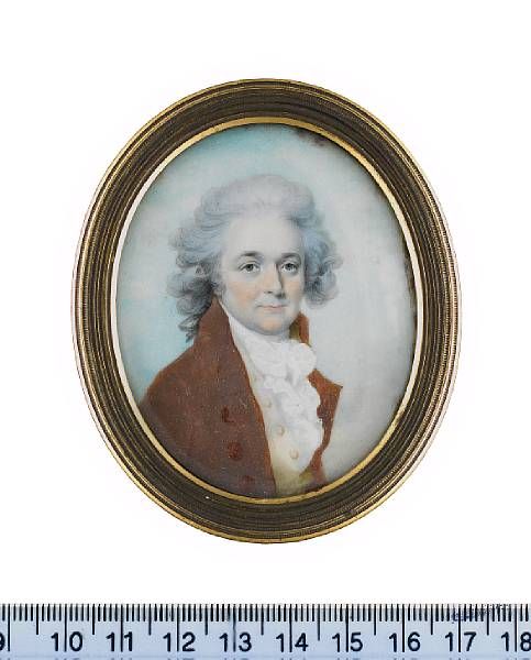 | A Gentleman, wearing brown coat, cream waistcoat, frilled white chemise and cravat, his hair powdered and worn en queue, with a | |
