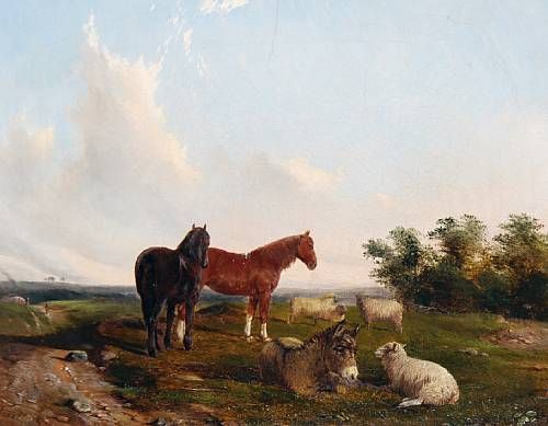 Horses, sheep and a donkey in a summer landscape