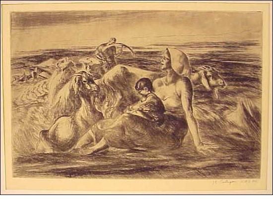 | farm scene with a family in the foreground and the father plowing in the background | |