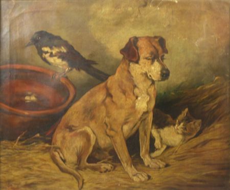 A DOG WITH A KITTEN AND A MAGPIE IN A BARN