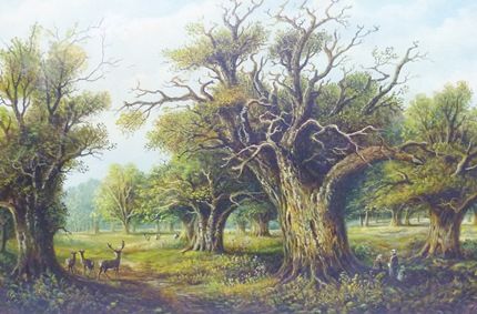 | Purportedly Charlecote Park, a woodland scene, mature trees in full leaf with deer on path and three girls in the foreground | |
