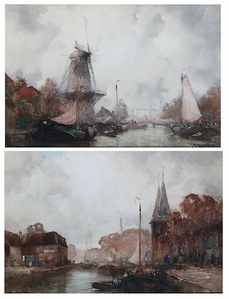 A Dutch canal scene, with barges by a windmill, and another, a pair